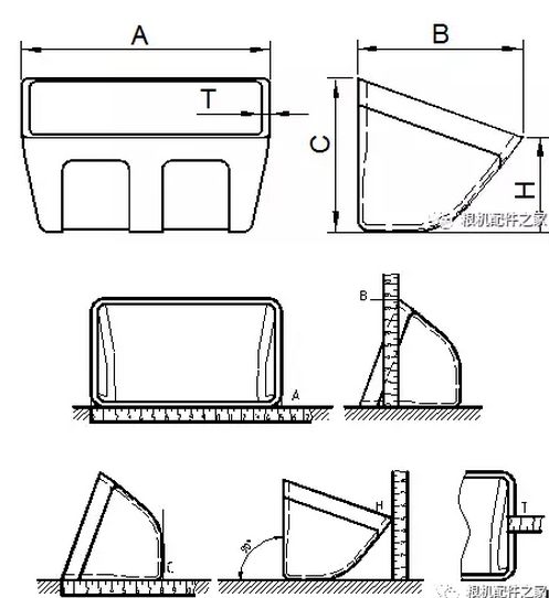 畚斗的測(cè)量:針對(duì)已有實(shí)物的畚斗進(jìn)行測(cè)量,正確測(cè)量方法如下圖